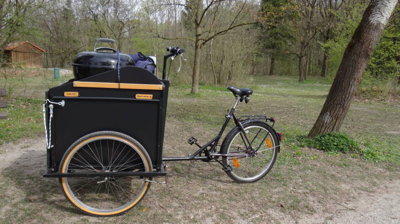 Unser Winter Projekt 2013/14 war ein Lastenrad mit Frontkoffer. Basis war ein 26 Zoll Damenrad aus Stahlrohr. Fast alle Eisenteile die wir für den Kastenunterbau und den Rahmen benötigten kommen aus dem Alteisen, das Holz stammt ebenso vom Sperrmüll. Am Ende ist ein Lastenrad herausgekommen das sich durchaus mit den kommerziellen Rädern messen kann. Wir konnten ohne Probleme einen Erwachsenen in der Kiste transportieren, so um die 100 kg Gewicht Zuladung sind kein Problem.