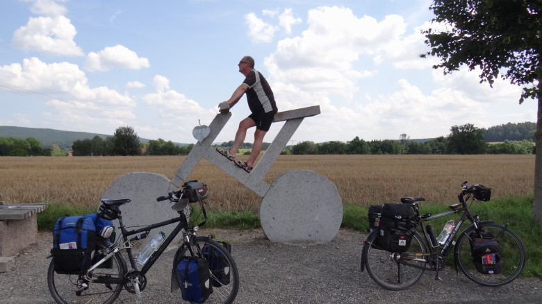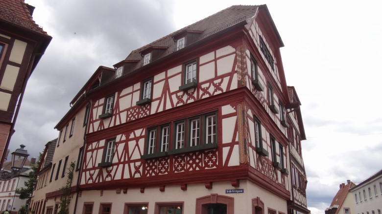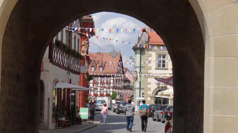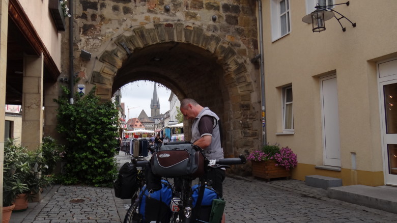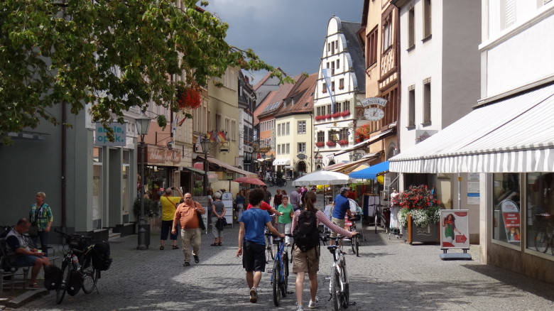 gebückt. Schöne Altstadt in Lohr, wir schieben die Räder